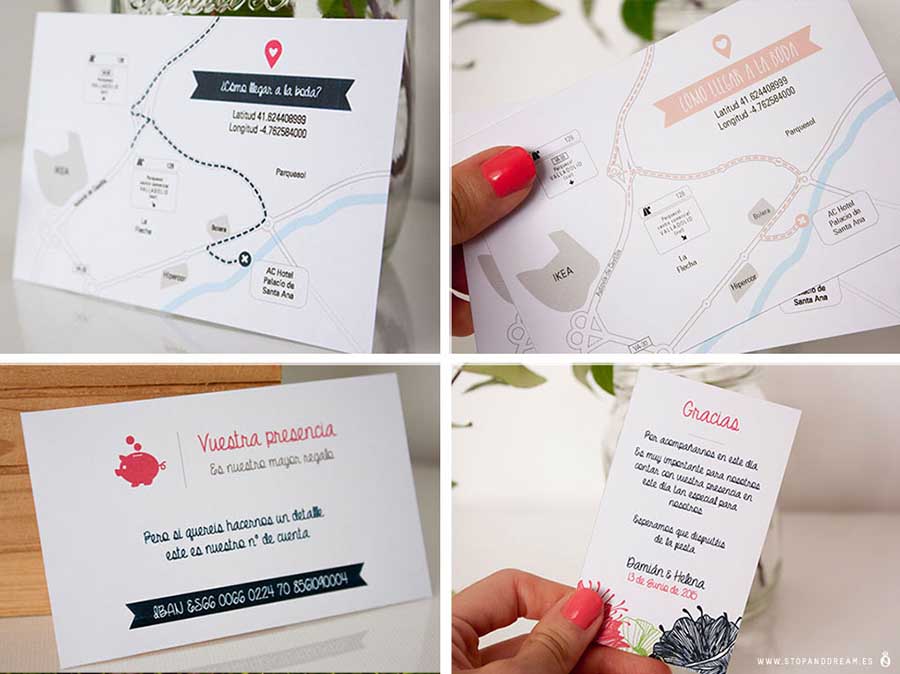 Centrándonos en otro punto importante en las invitaciones, cabe destacar la fuerte acogida que ha tenido entre los novios incluir dentro del sobre de sus invitaciones tarjetas informativas.  Por ejemplo una tarjeta con el mapa del destino o itinerario de ese día. O también incluir el número de cuenta o el horario de la ruta de los autobuses, todo ayuda para que el invitado tenga toda la información importante del evento. El diseño siempre suele ir acorde a la invitación para mantener una coherencia estética en todo el conjunto.